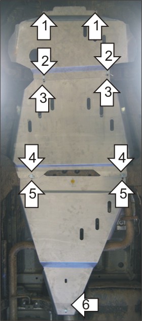 1. Ослабить болты пыльника, завести Первый Щит передними точками крепления под Штатный крепеж, либо установить Болты М6х40. 2. Задние точки наживить Болтами М8х30 в предварительно заложенные в раму ПУ 60х20х6 М8. 3. Открытые пазы Второго Щита заводятся на Болты М8х30. 4. Задние точки Второго Щита крепятся с помощью ПЗ 79х20х6 М10 и Болтов М10х60/Болтов М10х70 к раме. 5. Последний Щит заводится открытыми пазами на Болты М10х60/Болтов М10х70. 6. Задня точка Третьего Щита крепится на ПР 80х20х6 М10 и Болт М10х20.