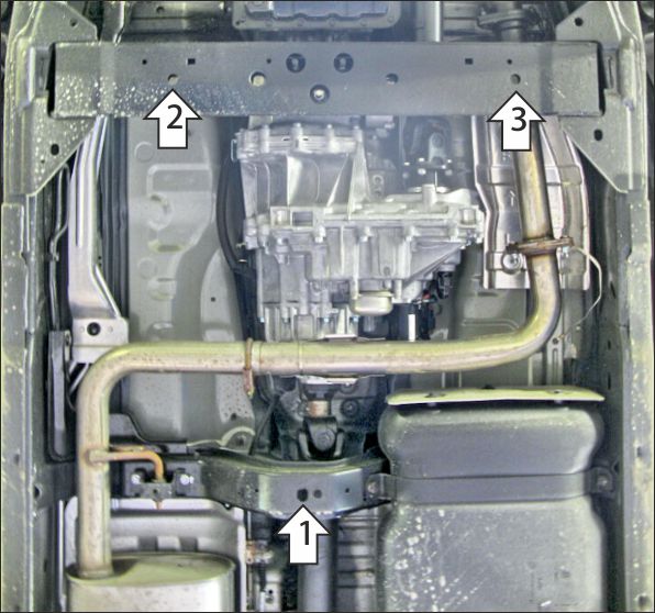 1. В штатное отверстие поперечины установить заднюю точку крепления защиты при помощи планки ПР 80х20х6 М10 (устанавливается внутрь поперечины) и болта М10х20 с шайбой и гр. шайбой 10. 2. В штатное отверстие поперечины установить переднюю правую точку крепления защиты при помощи планки ПЗ 79х20х6 М10 (устанавливается поверх поперечины) и болта М10х70 с шайбой и гр. шайбой 10. 3. В штатное отверстие поперечины установить переднюю левую точку крепления защиты при помощи планки ПЗ 79х20х6 М10 (устанавливается поверх поперечины) и болта М10х60 с шайбой и гр. шайбой 10. Затянуть весь крепеж с необходимым усилием.