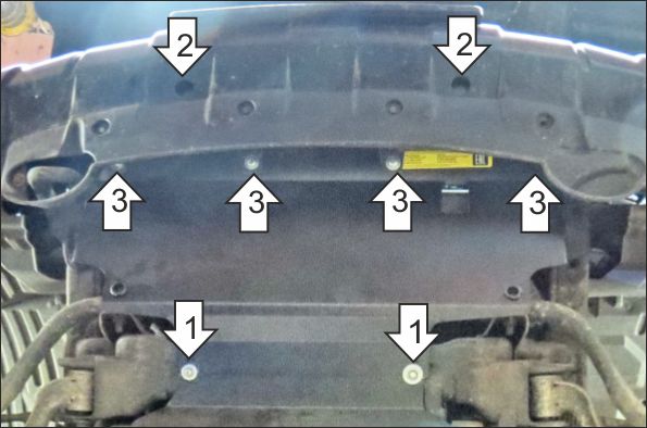 1. Снять накладку бампера и штатную защиту радиатора. Установить задние точки крепления защиты на штатные резьбовые отверстия в подрамнике при помощи болтов М6х30, с шайбами и гр. шайбами 6. 2. Установить передние точки крепления защиты на штатные резьбовые отверстия в проушинах усилителя бампера при помощи болтов М6х30, с шайбами и гр. шайбами 6. 3. Прикрепить кронштейны бампера к защите при помощи болтов М6х20, с шайбами и гр. шайбами 6. Установить обратно накладку бампера. Затянуть весь крепеж с необходимым усилием.
