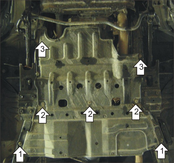 1. Снять пластиковый пыльник. Установить на раму КПП передние точки крепления переднего Щита Защиты при помощи Болтов М8х30, Шайб 8 и Гроверов 8. 2. Установить на поперечную балку рамы задние точки крепления переднего Щита Защиты при помощи Болтов М8х30, Шайб 8 и Гроверов 8. Установить передние точки крепления второго Щита Защиты на этот же крепеж. 3. Установить на продольные балки рамы задние точки крепления второго Щита Защиты при помощи Болтов М8х30, Шайб 8 и Гроверов 8.