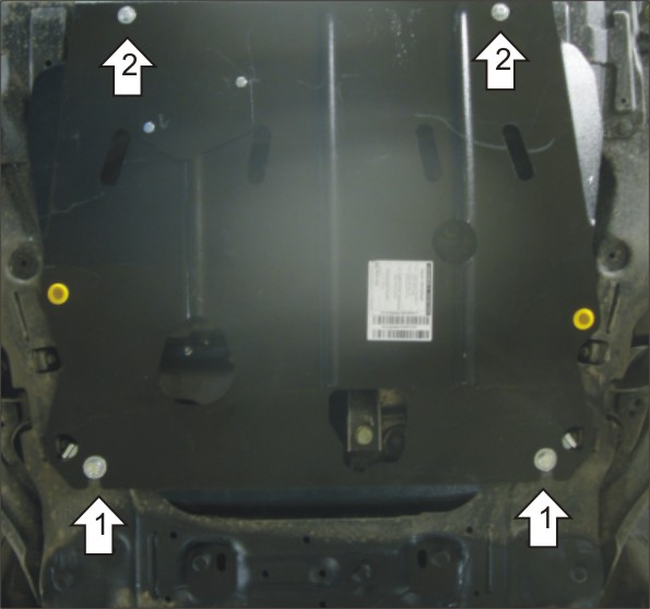 Защиту можно устанавливать как со снятием пыльника , так и на него, а на автомобилях Nissan Qashqai с 2015 года выпуска и под пыльник. 1.Соосно с отверстиями в подрамнике моторного отсека разместить ПЗ 61х20х6 А40 М10 и наживить Болты М10х30 с Шайбами и Гр. Шайбами 10. Завести задние точки защиты. 2.В отверстиях подрамника радиатора установить ПУ 60х14 А20 В10 М8. Закрепить передние точки защиты Болтами М8х30 с Шайбами и Гр. Шайбами 8.( при установке поверх пыльника- сделать отверстия в пыльнике и использовать Проставки 10 и Болты М8х40).