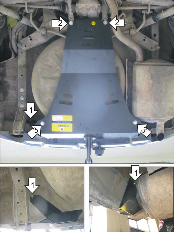 1. Установить на штатные болты крепления лонжеронов Кронштейны. 2. Установить на продольные балки усилителей передние точки защиты с помощью ПР 30х14х5 М8, Проставок 15 и Болтов М8х40. 3. Установить на ранее закрепленные Кронштейны задние точки защиты с помощью Болтов М10х30.