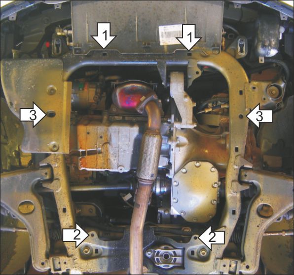 1. Установить в прямоугольные отверстия подрамника передние точки защиты с помощью КР 50 А10 М8х30 и гаек М8 с шайбами и гр. шайбами 8. 2. Установить в шестигранные отверстия подрамника задние точки защиты с помощью планок ПР 50х20х6 М8 и болтов М8х30 с шайбами и гр. шайбами 8. 3. Установить в сквозные отверстия подрамника средние точки защиты с помощью планок ПР 50х20х6 М8, проставок 15 и болтов М8х90 с шайбами и гр. шайбами 8. Затянуть весь крепеж с необходимым усилием.