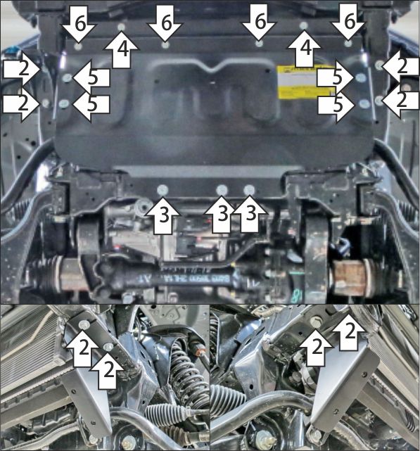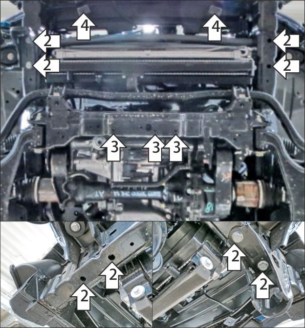 1. Снять штатный пластиковый пыльник. Для удобства монтажа передних точек крепления защиты радиатора снять губу переднего бампера автомобиля. 2. В штатные отверстия в лонжероне рамы установить кронштейн 02 при помощи закладных планок ПУ 60х14х6 M8, болтов М8х30 с шайбами и гр. шайбами 8. Под штатные болты крепления передней буксировочной проушины установить кронштейн 02-01. 3. Выкрутить передние болты крепления штатной защиты двигателя. Под штатную защиту двигателя в освободившиеся штатные резьбовые отверстия установить задние точки крепления щита защиты радиатора при помощи болтов М8х30 с шайбами и гр. шайбами 8. 4. Установить передние точки крепления защиты в штатные резьбовые отверстия крепления пластикового пыльника при помощи болтов М8х30 с шайбами и гр. шайбами 8 или при помощи болтов М6х30 с шайбами и гр. шайбами 6 (зависит от модификации автомобиля). 5. Прикрепить щит к кронштейнам при помощи болтов М8х30 с шайбами и гр. шайбами 8. 6. Прикрепить к щиту защиты передний бампер автомобиля при помощи болтов М6х30 с шайбами и гр. шайбами 6. 7. Вернуть на место губу переднего бампера автомобиля.