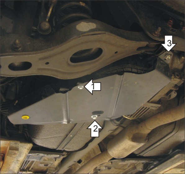 1. Установить Кронштейн 1 на штатное крепление. 2. Установить Кронштейн 2 на штатное крепление. 3. Установить крайнюю точку крепления Защиты при помощи штатного крепления. 4. Установить на раннее установленные Кронштейны 1 и 2 Защиту при помощи Болтов М8х30, Шайб 8 и Гроверов 8.