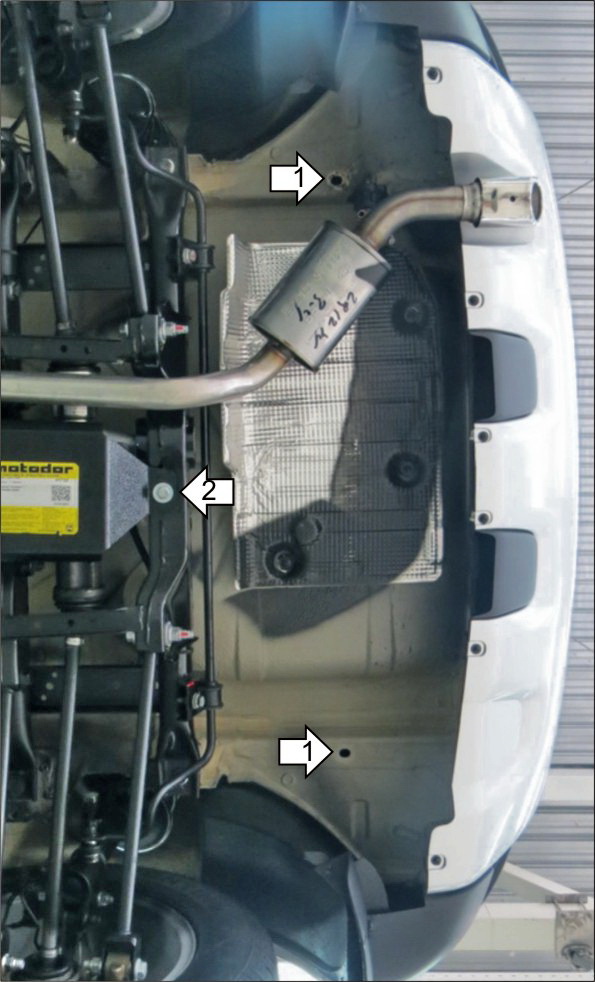 1. В отверстия в лонжеронах установить планки ПУ60х14х6 М8 (предварительно удалив резиновые заглушки), прикрепить к ним кронштейны при помощи болтов М8х30 с шайбами и гр. шайбами 8. 2. В отверстие в подрамнике задней подвески установить планку ПР80х20х6 М10 и прикрепить к ней щит при помощи болта М10х30 с шайбой и гр. шайбой 10. 3. Прикрепить щит к кронштейнам при помощи болтов М8х20 с шайбами и гр. шайбами 8. 4. Если на автомобиле не установлено ТСУ, прикрепить крышку при помощи болтов М8х14 с шайбами 8. Затянуть весь крепеж.