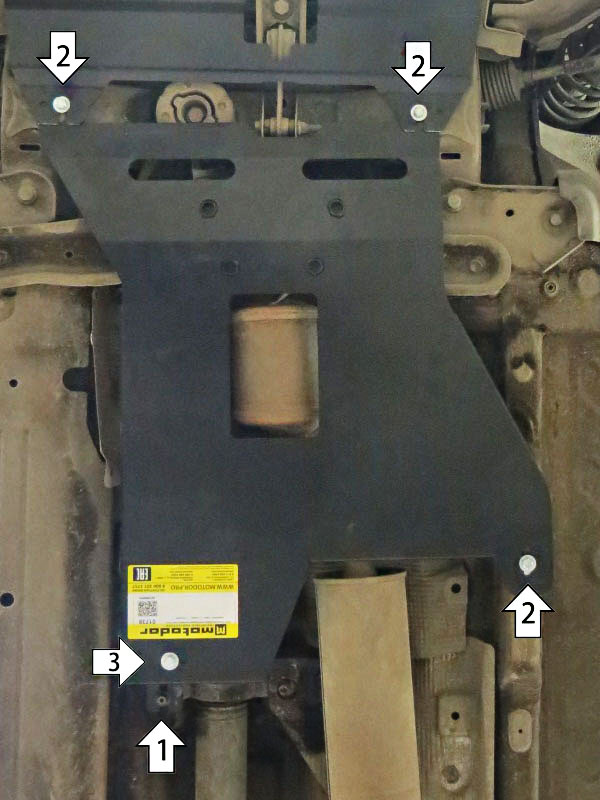 1. Открутить Штатный Болт крепления подвесного подшипника карданного вала. Закрепить на него Кронштейн (.02); 2. Заложить в отверстия ПР 50х20х6 М8, закрепить на них Болты М8х20 с Гр8 и Ш8. Установить защиту пазами в установленные Болты; 3. Закрепить к Кронштейну (.02) Защиту при помощи Болтов М8х20, Гр8 и Ш8.