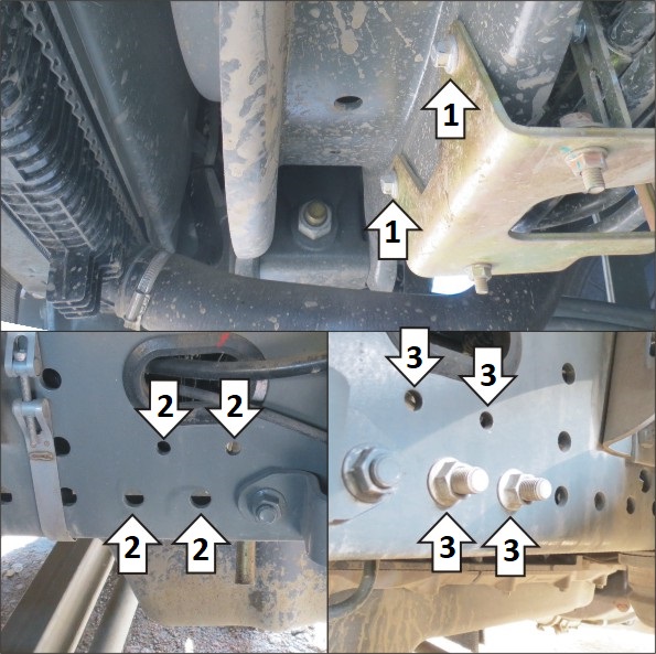 Защиту допускается устанавливать совместно с защитой радитора Motodor арт. 26205. 1. Под штатные болты крепления змеевика компрессора установить передний кронштейн. Если на автомобиле ранее установлена защита радиатора Motodor, то необходимо отвернуть болты крепления её щита к кронштейну. 2. Прикрепить задний правый кронштейн в штатные отверстия в раме автомобиля при помощи болтов М10х40 с шайбами 10 и гайками М10 в верхние отверстия кронштейна, либо болтов М12х40 с шайбами 12 и гайками М12 в случае наличия нижних отверстий в раме автомобиля. 3. Прикрепить задний левый кронштейн в штатные отверстия в раме автомобиля при помощи болтов М10х40 с шайбами 10 и гайками М10 в верхние отверстия кронштейна, либо болтов М12х40 с шайбами 12 и гайками М12 снизу. При наличии штатных болтов для крепления кронштейна можно использовать их. 4. Прикрепить щит к кронштейнам (если установлена защита радиатора, то совместно с ней) при помощи болтов М12х40 с шайбами 12 и гайками М12. Затянуть весь крепеж.