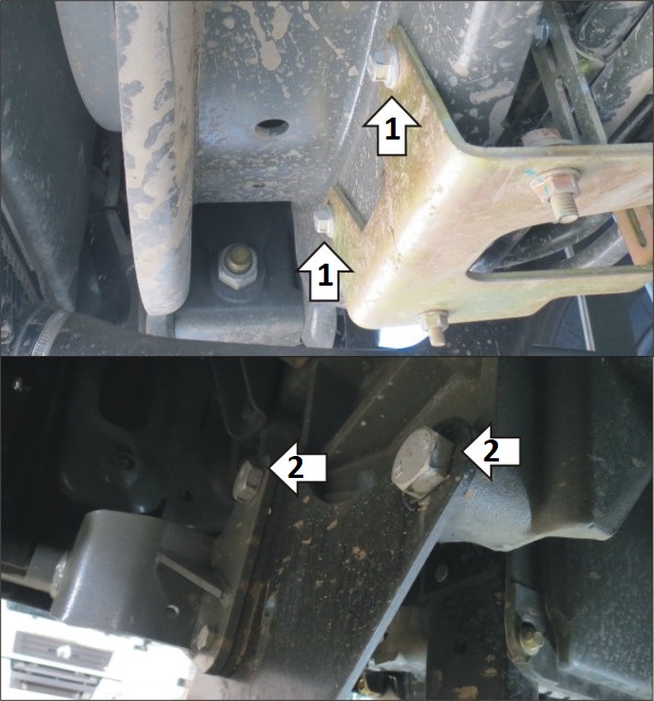 1. Под штатные болты крепления змеевика компрессора установить кронштейн. 2. Под штатные болты крепления кронштейна бруса установить боковины защиты, при необходимости использовать шайбы толщиной 6 мм из комплекта крепежа. 3. Прикрепить щит к кронштейну и боковинам при помощи болтов М12х40 с шайбами 12 и гайками М12.