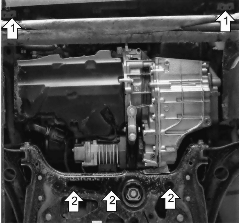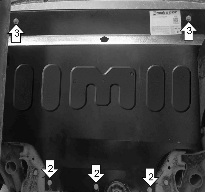 Снять штатный пластиковый пыльник, при его наличии. 1. Установить кронштейны в штатные резьбовые точки при помощи штатных болтов. 2. Завести защиту за бампер и прикепить задние точки крепления защиты к подрамнику при помощи штатных болтов. 3. Прикепить защиту к кронштейнам, при помощи болтов М8х20, шайб 8 и Гр. шайб 8 .