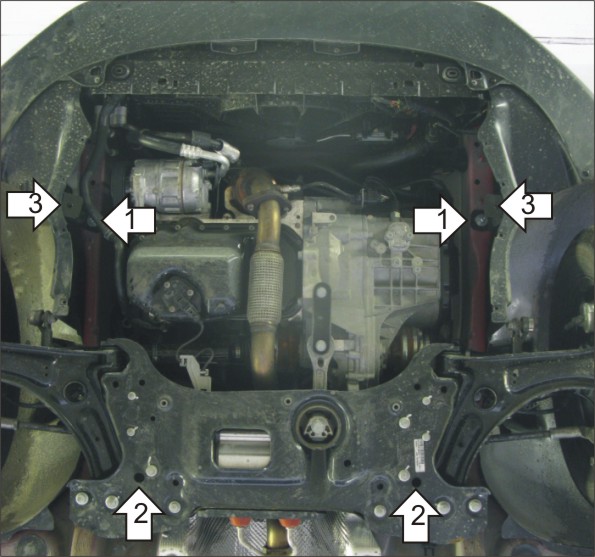 1. Установить на отверстия в лонжеронах Кронштейны при помощи ПБ 80х26х3 М10х35, Гаек М10, Шайб 10 и Гроверов 10. 2. Установить задние точки крепления Защиты на сквозные отверстия в подрамнике при помощи ПР 70х20х6 А15 М10, Болтов М10х35, Проставок 15, Шайб 10 и Гроверов 10. 3. Установить передние точки крепления Защиты на раннее установленные Кронштейны при помощи Болтов М10х30, Шайб 10 и Гроверов 10.
