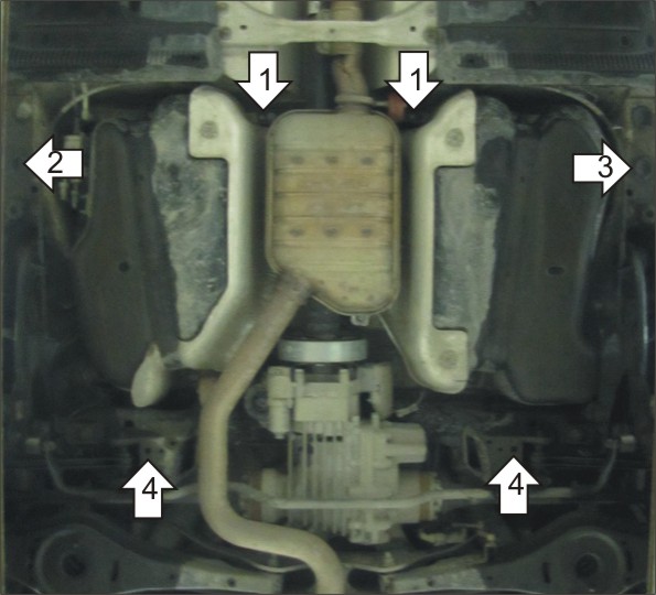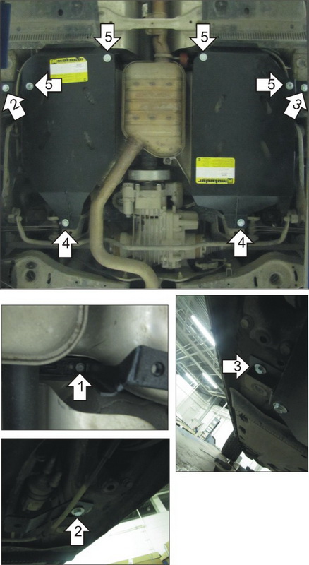 1. Установить на штатные резьбовые отверстия совместно с кронштейном глушителя Кронштейны №1, используя штатный крепеж. 2. Установить на лонжерон Кронштейн №2 при помощи ПР 80х20х6 М10, Болтов М10х30, Шайб 10 и Гроверов 10. 3. Установить на лонжерон Кронштейн №3 при помощи ПР 80х20х6 М10, Болтов М10х30, Шайб 10 и Гроверов 10. 4. Установить на чашки задней подвески задние крепежные точки Защиты при помощи ПР 50х20х6 М8, Болтов М8х20, Шайб 8 и Гроверов 8. 5. Установить на ранее установленные Кронштейны передние точки Защиты при помощи Болтов М10х20, Шайб 10 и Гроверов 10.
