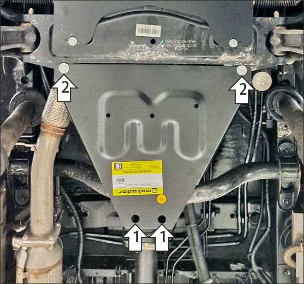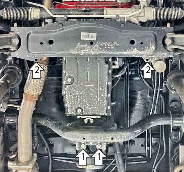 1. Под штатные гайки крепления опоры КПП установить задние точки крепления защиты. 2. В штатные отверстия в подрамнике установить передние точки крепления защиты при помощи закладных планок ПР70х20х6 М10 и болтов М10х20 с шайбами и гр. шайбами 10. Затянуть весь крепеж с требуемым усилием.