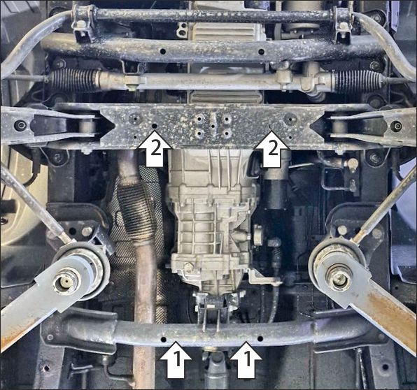 1. Установить скобы крепления защиты на траверсу коробки переключения передач. 2. В штатные отверстия в подрамнике автомобиля установить передние точки крепления защиты при помощи закладных планок ПР70х20х6 М10 и болтов М10х30 с шайбами и гр. шайбами 10. 3. Прикрепить щит к ранее установленным скобам при помощи болтов М10х30 с шайбами и гр. шайбами 10. Затянуть весь крепеж с требуемым усилием.