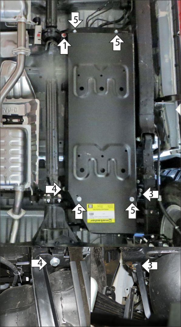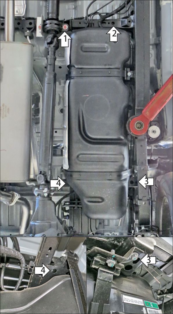 1. Под штатный болт крепления подвесного подшипника карданного вала установить кронштейн 1. 2. В штатное отверстие в поперечине рамы установить кронштейн 2 при помощи закладной планки ПУ60х14х6 М8 (планку установить внутрь поперечины) и болта М8х30 с шайбой и гр. шайбой 8. 3. В штатное отверстие в раме установить кронштейн 3 при помощи закладной планки ПР70х20х6 М10 и болта М10х30 с шайбой и гр. шайбой 10. 4. В штатное отверстие в поперечине рамы установить кронштейн 4 при помощи закладной планки ПР70х20х6 М10 и болта М10х30 с шайбой и гр. шайбой 10. 5. Прикрепить щит к кронштейнам при помощи болтов М8х20 с шайбам и гр. шайбами 8. Затянуть весь крепеж с требуемым усилием.
