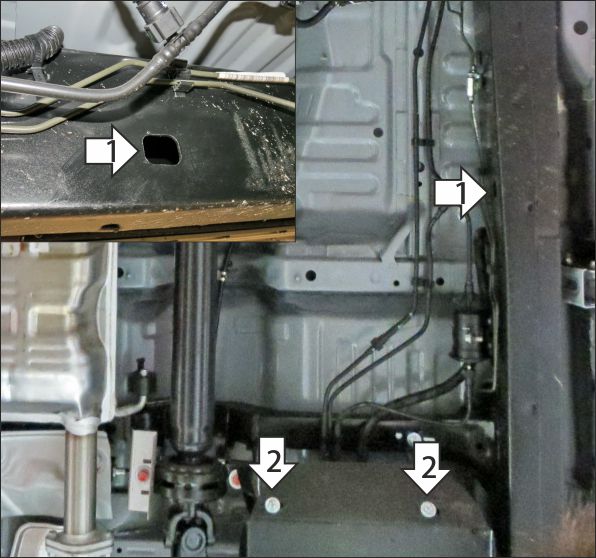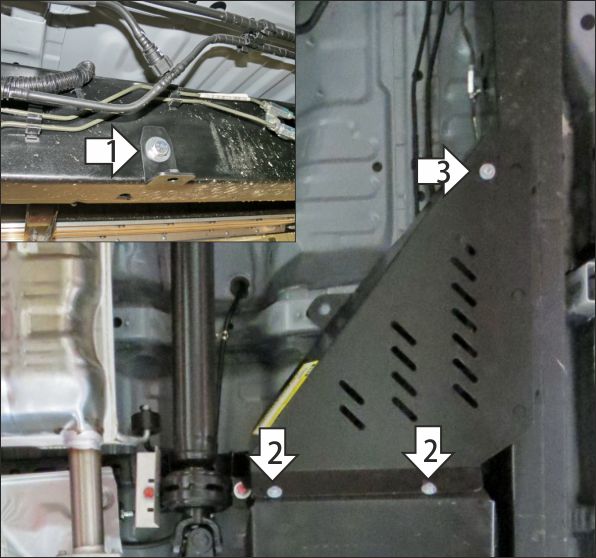 Защита устанавливается только совместно с защитой топливного бака Motodor! 1. В штатное отверстие в лонжероне рамы установить кронштейн при помощи закладной планки ПР70х20х6 М10 и болта М10х30 с шайбой и гр. шайбой 10. 2. Отвернуть на несколько оборотов болты крепления защиты топливного бака к передним кронштейнам и установить под них задние точки крепления щита. 3. Прикрепить щит к кронштейну при помощи болта М8х30 с шайбой и гр. шайбой 8. Затянуть весь крепеж с требуемым усилием.