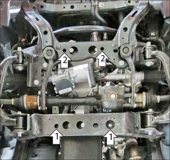 Снять штатную защиту двигателя при её наличии. 1. В штатные отверстия в поперечине рамы установить задние точки крепления защиты при помощи закладных планок ПР80х20х6 М10 и болтов М10х30 с шайбам и гр. шайбами 10. 2. В штатные отверстия в поперечине рамы установить передние точки крепления защиты при помощи закладных планок ПР70х20х6 М10 и болтов М10х30 с шайбам и гр. шайбами 10. Затянуть весь крепеж с требуемым усилием.