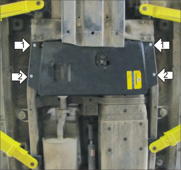 1. Установить на штатные резьбовые отверстия в лонжеронах передние точки крепления Защиты при помощи Болтов М8х30, Гроверов 8 и Шайб 8. 2. Установить на штатные резьбовые отверстия в лонжеронах задние точки крепления Защиты при помощи Болтов М8х30, Гроверов 8 и Шайб 8.