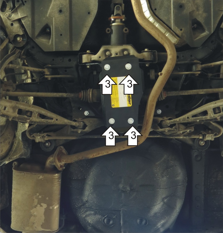 1. Отвернуть гайки крепления сайлентблоков заднего дифференциала и прикрепить на них Передний Кронштейн. 2. В отверстия в подрамнике закрепить Задний Кронштейн при помощи ПУ 60х14х6 А20 М8 и Болтов М8х30 с Шайбами 8 и Гроверами 8. 3. К Кронштейнам прикрепить Щит при помощи Болтов М10х20 с Шайбами 10 и Гроверами 10.