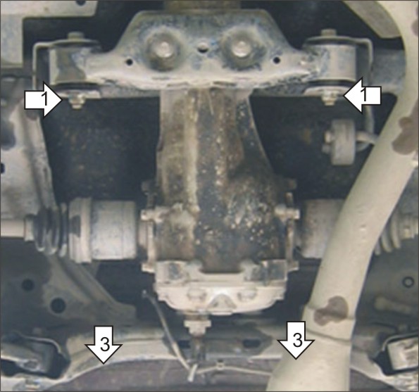 1. Установить на Штатные болты автомобиля Балку. 2. Установить на раннее установленную Балку передние точки крепления Защиты при помощи Болтов М10х20, Шайб 10 и Гроверов 10. 3. Установить на поперечную балку задние точки крепления Защиты при помощи Планок специальных, Болтов М10х30, Шайб 10 и Гроверов 10.