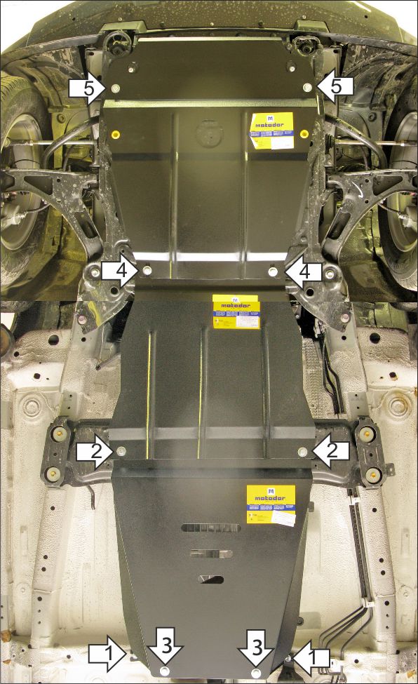 Снять штатный пластиковый пыльник под двигателем. 1. Установить в штатные резьбовые отверстия кузова балку с помощью болтов М8х20 с шайбами и гр. шайбами 8. 2. Установить в штатные сквозные отверстия поперечины под КПП передние точки крепления щита 3 совместно с задними точками крепления щита 2 при помощи планок ПР 80х20х6 М10 и болтов М10х60 с шайбами и гр. шайбами 10. 3. Прикрепить задние точки крепления щита 3 балке с помощью болтов М10х20 с шайбами и гр. шайбами 10. 4. Установить в штатные отверстия подрамника передние точки крепления щита 2 совместно с задними точками крепления щита 1 с помощью планок ПР 80х20х6 М10 и болтов М10х30 с шайбами и гр. шайбами 10. 5. Установить в штатные отверстия подрамника передние точки крепления щита 1 с помощью планок ПР 80х20х6 М10 и болтов М10х30 с шайбами и гр. шайбами 10. Затянуть весь крепеж с требуемым усилием.