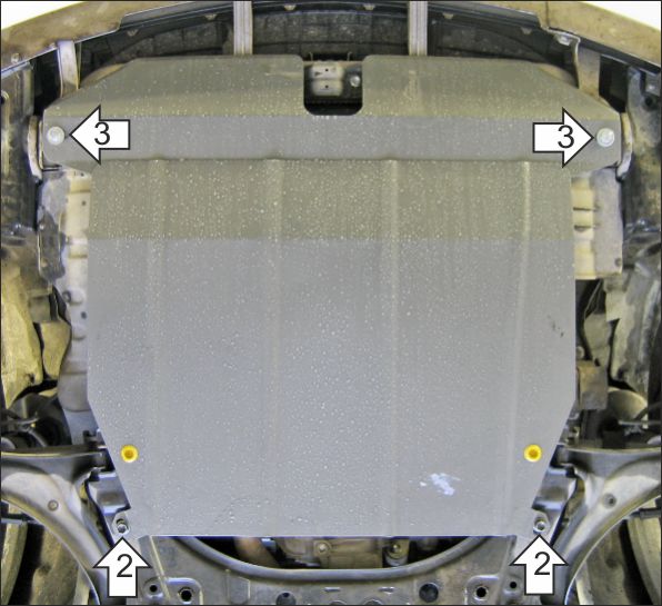 1. В штатные буксировочные проущины установить уголки А25 М10 при помощи болта М10х30 и шайбы 45 с шайбой и гр. шайбой 10 слева и при помощи болта М10х40, буксировочной проушины из комплекта крепежа, шайбы и гр. шайбы 10 справа. 2. Под штатные болты подрамника подвески установить задние точки крепления защиты. 3. Прикрепить передние точки крепления защиты к уголкам при помощи болтов М10х20 с шайбами и гр. шайбами 10. Затянуть весь крепеж.