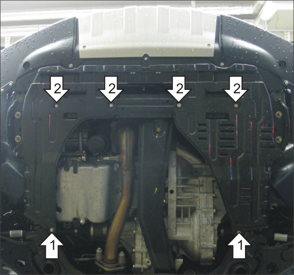 1. Выкрутить болты крепления пластикового пыльника в соответствии со схемой в инструкции. Установить задние точки крепления защиты в штатные высвободившиеся резьбы при помощи болтов М6х30 с шайбами и гр. шайбами 6. 2. Установить передние точки крепления защиты в штатные резьбовые ранее освобожденные отверстия при помощи проставок 10, болтов М6х40 с шайбами и гр. шайбами 6. Затянуть весь крепеж.