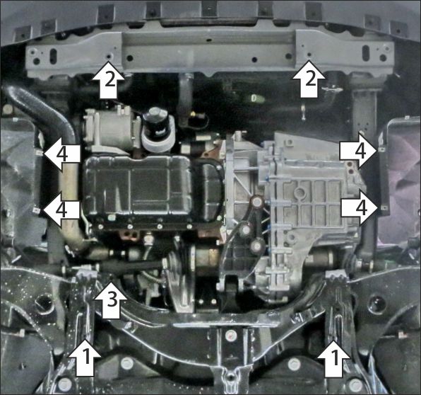 Снять штатный пластиковый пыльник при его наличии. 1. В штатные отверстия в подрамнике подвески установить задние точки крепления защиты при помощи закладных планок ПР30х14 М8, болтов М8х30 с шайбами и гр. шайбами 8. 2. В штатные отверстия в подрадиаторной балке установить передние точки крепления защиты при помощи клипс КЛ51х20 М8 и болтов М8х30 с шайбами и гр. шайбами 8. 3. В штатное отверстие в подрамнике подвески установить правую точку крепления защиты при помощи клипсы КЛ51х20 М8, проставки 25 и болта М8х50 с шайбой и гр. шайбой 8. 4. Прикрепить локеры к защите штатными саморезами. Затянуть весь крепеж.