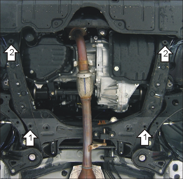 1. Установить соосно с отверстиями подрамника ПР 80х20х6 М10 и наживить Болты М10х90 с Шайбами и Гр. Шайбами 10. Завести задние точки крепления защиты. 2. Установить соосно с отверстиями подрамника ПЗ 61х20х6 А40 М10. Закрепить передние точки защиты с помощью Болтов М10х110, Проставок 25, Шайб и Гр. Шайб 10.