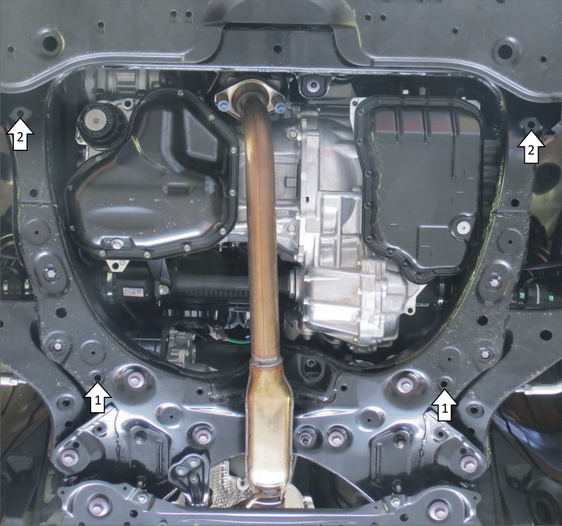 При наличии снять штатный пыльник на автомобиле. 1. Установить на подрамник задние точки Защиты при помощи ПР 80х20х6 М10, Болтов М10х90, Шайб 10 и Гроверов 10, предварительно вынув заглушки из крепежных отверстий. 2. Для удобства установки можно снять боковые пыльники Установить на подрамник передние точки Защиты при помощи ПР 80х20х6 М10, Болтов М10х90, Шайб 10 и Гроверов 10, предварительно вынув заглушки из крепежных отверстий. Затянуть весь крепеж.