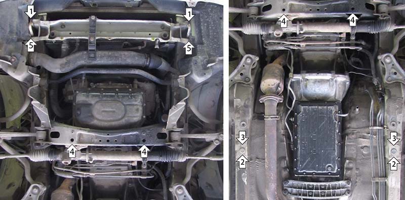 1. Установить на буксировочные проушины Уголки А25 М10, при помощи Болтов М10х40, Гр10 и Ш10 и Петель буксировочных. 2. Установить Балку (Щита коробки) в лонжероны при помощи ПУ 60х14 М8, Болтов М8х30, Гр8 И Ш8. 3. Установить задние точки крепления заднего щита на ранее установленную балку при помощи Болтов М10х20, Гр10 и Ш10. 4. Установить совместно передние точки крепления заднего щита и задние точки крепления переднего щита на подрамник автомобиля при помощи ПУ 60х14 М8, Болтов М8х40, Гр8 и Ш8. 5. Установить передние точки переднего щита на ранее установленные Уголки А25 при помощи Болтов М10х20, Гр10 и Ш10.