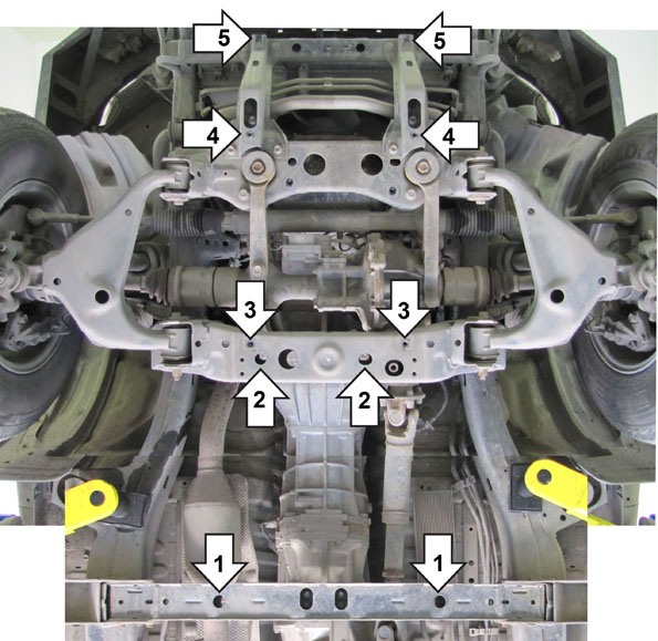 Снять штатные пыльники. 1. Первым устанавливается Щит 2 (задний). В точки 1 прикрутить кронштейны болтами M10x70 и планок ПЗ 101x20x6 M10. Чтобы не перепутать стороны, на кронштейнах сделаны риски - они должны быть направлены к бортам автомобиля. Установить на кронштейны щит при помощи 4-х Болтов М8х20. 2. Щит 1 (передний) устанавливается на Щит 2, так чтобы на них совпали отверстия в точках 2 и 3. В точках 2 закрутить Болты M10x90 на планки ПЗ 101x20x6 M10. 3.4.5. Закрутить Штатные болты M8.