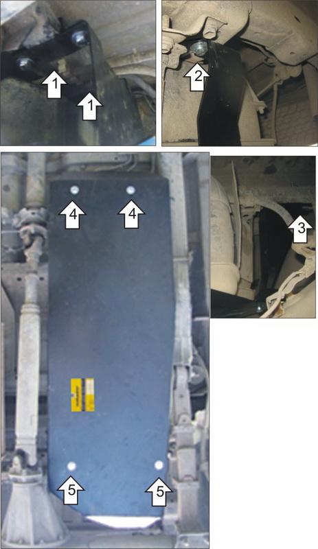 Установить напротив опор шарниров передней подвески задние точки крепления Защиты при помощи ПГ 30х14х5 М8, Проставок 15, Болтов М8х50, Шайб 8 и Гроверов 8.