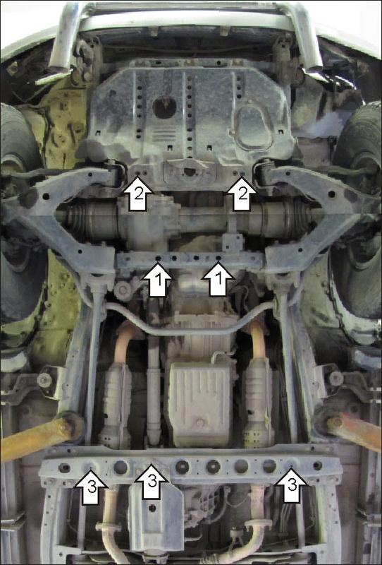 1.В отверстия подрамника передней подвески установить ПУ 60х14х6 А20В10 М8 и навесить передние точки крепления второго щита на Болты М8х30 с Шайбами 10, Шайбами и Гр. Шайбами 8. Завести задние точки первого щита. 2.Закрепить к подрамнику передние точки первого щита при помощи ПР 50х20х6 М8, болтов М8х30 с Шайбами 10, Шайбами и Гр. Шайбами 8. 3. Закрепить к поперечной балке задние точки второго щита в штатные резьбовые отверстия Болтами М8х30 с Шайбами 10, Шайбами и Гр. Шайбами 8.