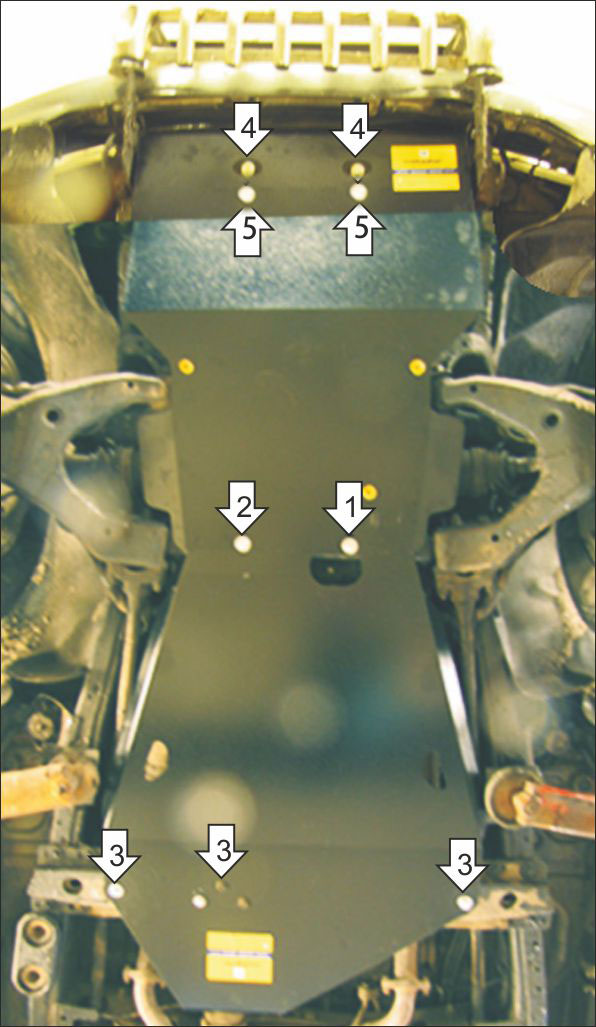 1. Снять штатные защиты радиатора и раздаточной коробки. Установить в отверстие поперечной балки автомобиля левую переднюю точку второго щита с помощью планки ПУ 60х14х6 А20В10 М8 и болта М8х35 с шайбами и гр. шайбами 8. 2. Установить в сквозное отверстие поперечной балки автомобиля правую переднюю точку второго щита с помощью планки ПЗ 56х20х6 А30 М10 и болта М10х80 с шайбой и гр. шайбой 10. 3. Установить в штатные резьбовые отверстия поперечной балки опоры КПП 5 задних точек второго щита с помощью болтов М8х35 по краям и М8х30 в середине (с шайбами и гр. шайбами 8). Установить задние точки переднего щита совместно с передними точками заднего щита. 4. Установить в сквозные отверстия поперечное балки перед радиатором кронштейн с помощью планок ПЗ 56х20х6 А30 М10 и болтов М10х80 с шайбами и гр. шайбами 10. 5. Прикрепить первый щит к кронштейну при помощи болтов М10х30 с шайбами и гр. шайбами 10. Затянуть весь крепеж с требуемым усилием.
