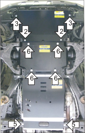 1. Установить на крепление транспортировочных проушин Кронштейны при помощи штатного крепежа. 2. Установить на поперечную балку в средней части моторного отсека задние точки крепления переднего Щита Защиты вместо штатных болтов крепления пыльника при помощи Проставок 35, Болтов М8х60, Шайб 8 и Гроверов 8. 3. Установить на раннее установленные Кронштейны передние точки крепления первого Щита Защиты при помощи Болтов М10х20, Шайб 10 и Гроверов 10. 4. Установить на поперечную балку передней подвески задние точки крепления второго Щита Защиты при помощи ПЗ 79х20х6 А60 М10, Болтов М10х30, Шайб 10 и Гроверов 10. 5. Установить на поперечную балку задние точки крепления третьего Щита Защиты при помощи ПЗ 61х20х6 А40 М10, Болтов М10х30, Шайб 10 и Гроверов 10. 6. Закрепить между собой первый и второй, второй и третий Щиты Защиты при помощи Болтов М10х20, Шайб 10 и Гроверов 10.