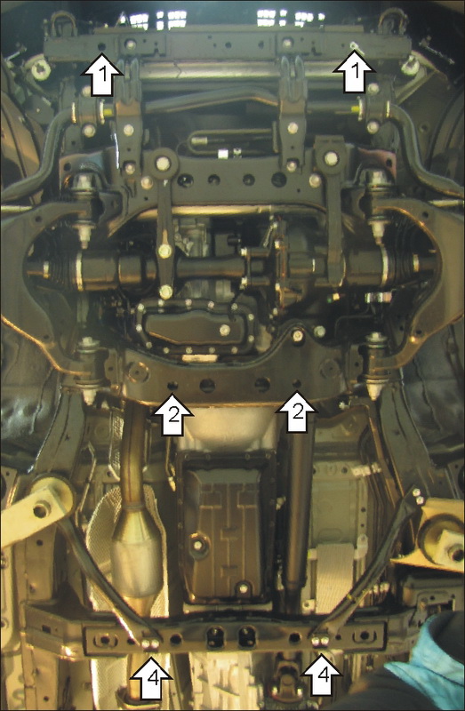 1.Сняв штатный пыльник, установить Переднюю Балку на поперечную балку под радиатором с помощью Проставок 15, Болтов М10х60 и ПЗ 61х20х6 А40 М10. 2.Установить задние точки первого щита с помощью болтов М10х30 и ПЗ 106х20х6 А85 М10. 3.Установить передние точки первого щита к Балке с помощью болтов М10х20. 4.Установить заднюю балку с помощью Болтов М10х110. 5.Установить передними открытыми пазами второй щит совместно с задними точками первого щита и закрепить его к задней Балке Болтами М10х20.
