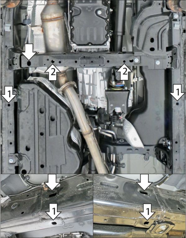 1. В штатные отверстия в лонжеронах рамы установить балку при помощи планок ПР 70х20х6 М10, болтов М10х30 с шайбами и гр. шайбами 10. Планки удобно закладывать через отверстия в боковой стенке рамы, закрытые пластиковыми заглушками. 2. В штатные отверстия в поперечине рамы установить передние точки крепления щита при помощи планок ПР 70х20х6 М10, болтов М10х40 с шайбами и гр. шайбами 10, правую планку удобно устанавливать через отверстие, отмеченное стрелкой. 3. Прикрепить задние точки щита к балке при помощи болтов М10х20 с шайбами и гр. шайбами 10. Затянуть весь крепеж.