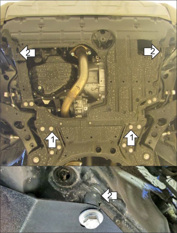 Защита устанавливается поверх штатного пластикового пыльника. 1. Установить на штатные болты крепления подрамника задние точки защиты. 2. Прорезать отверстия в пыльнике напротив передних точек крепления защиты. Установить в сквозные отверстия подрамника передние точки крепления защиты при помощи планок ПЗ 61х20х6 А40 М10, проставок 35, шайб 14 и болтов М10х100 с шайбами и гр. шайбами 10. Планки удобно закладывать через прямоугольные отверстия в защите. 3. Прикрепить лючок к защите при помощи болтов М8х16 с шайбами 8 (если выхлопная труба не выступает за защиту). Затянуть весь крепеж с требуемым усилием.
