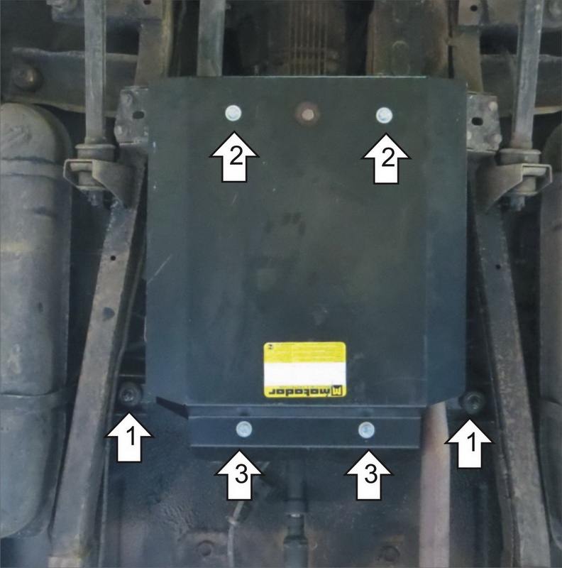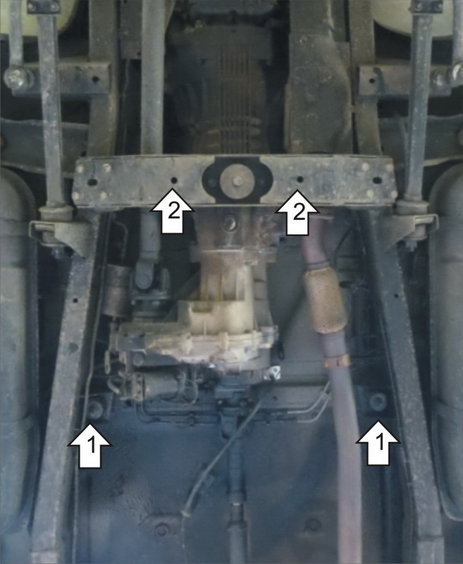 1. Отвернуть гайки крепления опор кузова к раме, снять подушки и под них установить Балку, вернуть на место подушки и затянуть гайки. 2. В отверстия в поперечине рамы заложить ПР 70х20х6 М10, прикрепить к ним Щит при помощи Болтов М10х30 с Шайбами 10 и Гроверами 10. 3. Прикрепить Щит к Балке при помощи Болтов М10х20 с Шайбами 10 и Гроверами 10, затянуть весь крепеж.