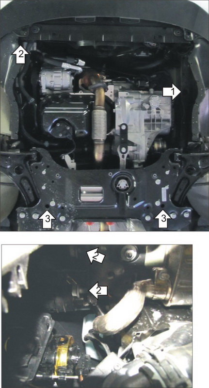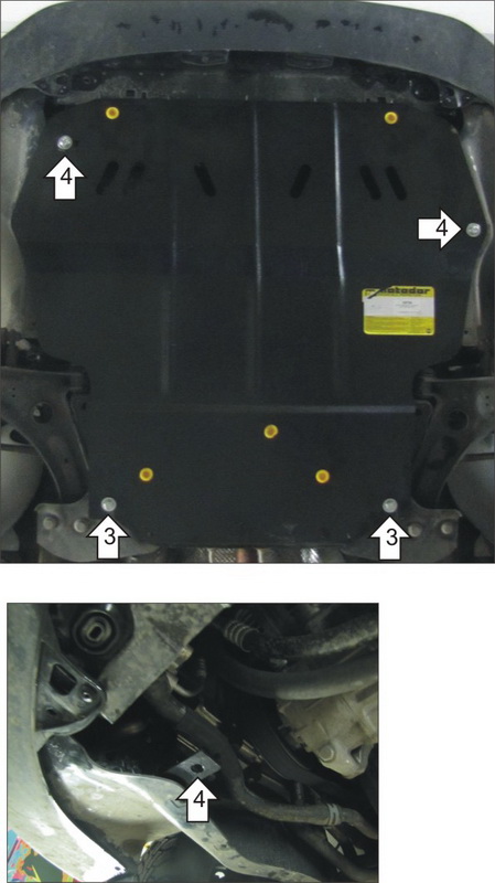 1. Установить на левый лонжерон S-образный Кронштейн при помощи ПБ 80х26х3 М10х35, Гайки М10, Шайбы 10 и Гровера 10. 2. Установить на правый лонжерон с помощью Штатных болтов крепления усиления бампера второй Кронштейн. 3. Установить задние точки крепления Защиты на сквозные отверстия в подрамнике при помощи: а) ПР 70х20х6 А15 М10, Болтов М10х35, Проставок 15, Шайб 10 и Гроверов 10 - если у автомобиля стальной подрамник; б) ПР 70х20х6 А15 М10, Болтов М10х90, Проставок 45, Шайб 10 и Гроверов 10 - если у автомобиля силуминовый подрамник. 4. Установить передние точки крепления Защиты на раннее установленные Кронштейны при помощи Болтов М10х30, Шайб 10 и Гроверов 10.