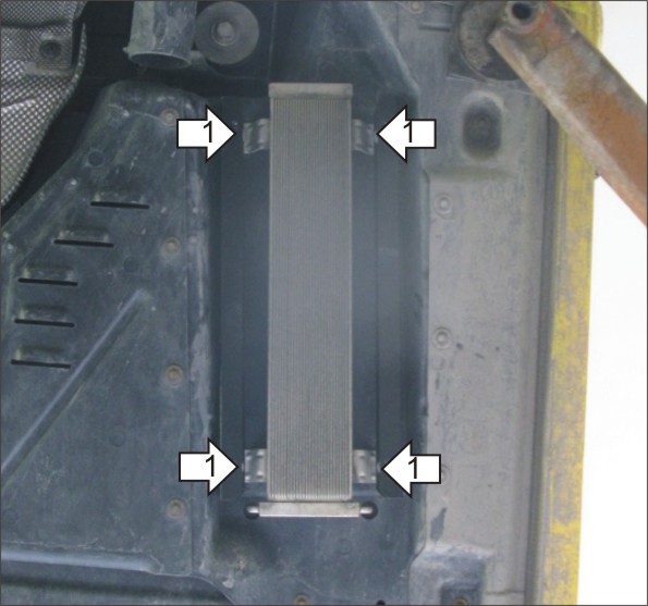 1. Скобы установить на штатные резьбовые точки крепления топливоохладителя к автомобилю. 2. Защиту установить на раннее установленные Скобы при помощи Болтов М8х20, Шайб 8 и Гроверов 8.