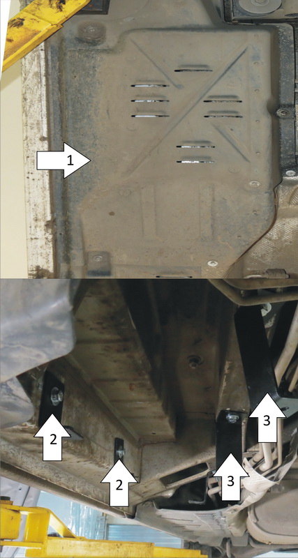 1. При наличии снять штатный пластиковый пыльник. 2. Установить два кронштейны в кузов а/м при помощи ПУ 60х14х6 М8, Болтов М8х30, Гр8 и Ш8 в отверстия кузова. 3. Установить два кронштейн в лонжерон при помощи ПР 50х20х6 М8, Болтов М8х30, Гр8 и Ш8. 4. Установить пластиковый пыльник, по месту сделать отверстия под кронштейны. 5. Установить на кронштейны щит при помощи Болтов М8х30, Гр8 и Ш8.