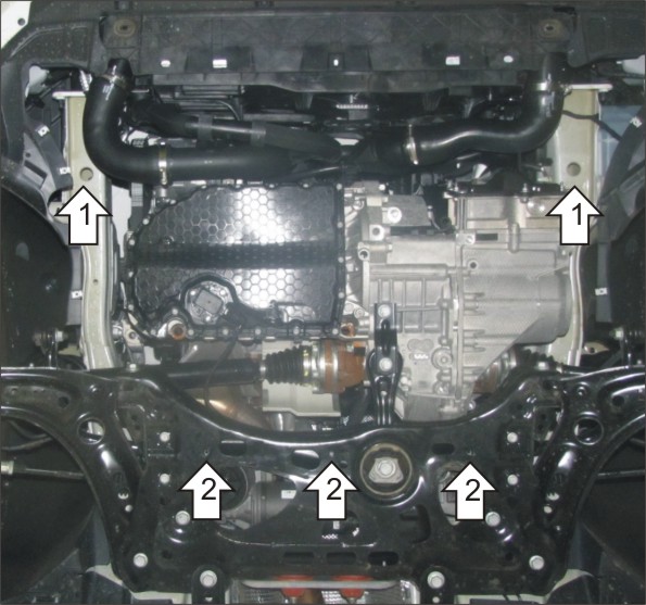 1. Снять штатный пластиковый пыльник. Установить в отверстия лонжеронов Кронштейны с помощью ПР 80х20х6 М10, Болтов М10х30 Шайб 10 и Гр. Шайб 10. 2. Наживить Болты М8х30 с Шайбами 8 и Гр. Шайбами 8 в количестве 3 шт. в штатные резьбовые отверстия подрамника автомобиля и завести задние точки крепления щита. 3. Установить передние точки защиты к ранее закрепленным Кронштейнам с помощью Болтов М10х20, Шайб 10 и Гр. Шайб 10. Затянуть все элементы крепления с необходимым усилием.