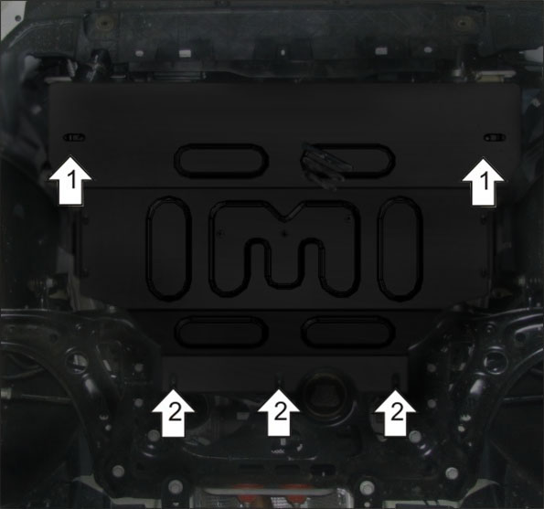 1. Снять штатный пластиковый пыльник. Установить в отверстия лонжеронов Кронштейны с помощью ПР 80х20х6 М10, Болтов М10х30, Гр. Шайб 10 и Шайб 10. 2. Наживить Болты М8х30 с Гр. Шайбами 8 и Шайбами 8 в количестве 3 шт в штатные резьбовые отверстия подрамника автомобиля и завести задние точки крепления щита. 3. Установить передние точки защиты к ранее закрепленным Кронштейнам с помощью Болтов М10х20, Гр. Шайб 10 и Шайб 10. 4. Затянуть все элементы крепления с необходимым усилием.