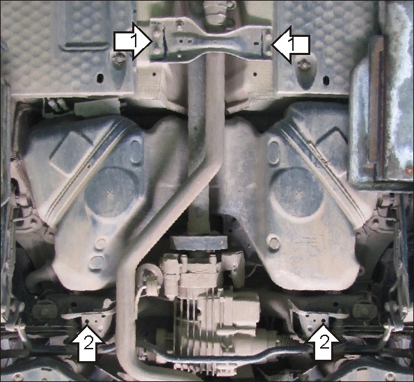 1. Установить Кронштейны на штатные болты а/м. 2. Вынуть из отверстий в кузове а/м заглушки и установить в них боковые точки крепления Защиты с помощью Планок со Шпильками ПБ80х26х3 и Гаек М10. 3. Установить задние точки Защиты с помощью Планок ПР70х20х6М10 и Болтов М10х20. 4. Установить на ранее установленные Кронштейны передние точки Защиты с помощью Болтов М10х20.
