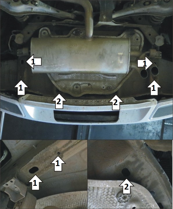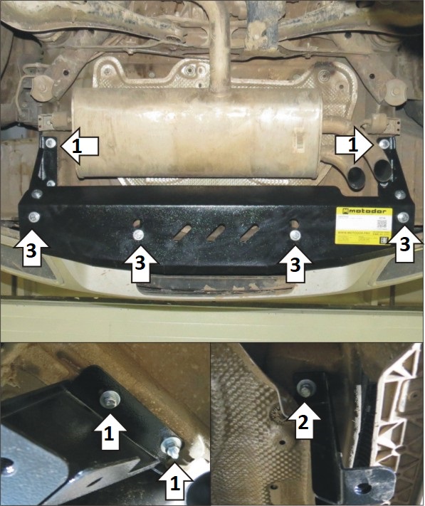 Защита устанавливается только на автомобили в комплектации Offroad и с двигателем объёмом 1,4 литра! 1. Установить боковые кронштейны (.02 и .02-01) в штатные отверстия лонжеронов автомобиля при помощи планок ПБ М10х35 с гайками М10, шайбами и гр. шайбами 10 спереди и в штатные резьбовые отверстия лонжеронов сзади. 2. Установить центральные кронштейны (.03) в штатные отверстия в кузове автомобиля при помощи планок ПР50х20х6 М8, болтов М8х30 с шайбами и гр. шайбами 8. 3. Прикрепить щит к кронштейнам при помощи болтоа М10х20 с шайбами и гр. шайбами 10. Затянуть весь крепеж.