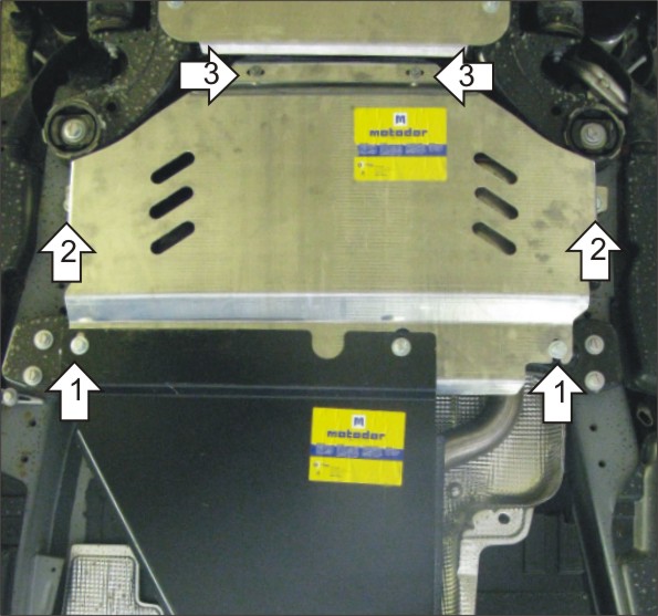 1. Установить на поперечную балку задние точки крепления Защиты при помощи ПЗ 61х20х6 А40 М10, Болтов М10х100, Шайб 10 и Гроверов 10. 2. Установить на продольные балки кузова средние точки крепления Защиты при помощи ПБ 80х20х3 А16 М10, Гаек М10, Шайб 10 и Гроверов 10. 3. Установить на поперечную балку передней подвески передние точки крепления Защиты при помощи штатного крепежа пыльника.
