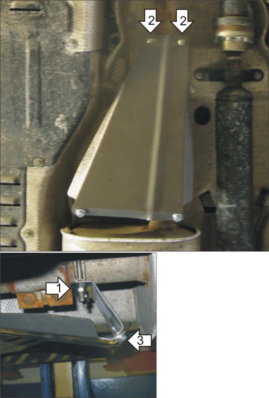 1. Закрепить кронштейн на глушителе используя скобу ETR50-60. Крепеж не затягивать. 2. Закрепить щит на глушителе используя скобу ETR50-60. Совместить нижние отверстия щита и кронштейна. Крепеж не затягивать. 3. Закрутить болты M8x20. 4. Затянуть весь крепеж.
