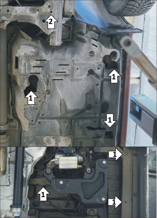 Защита устанавливается поверх штатного пыльника предпускового подогревателя и только с защитой топливного бака. 1. Снять штатный пыльник. Установить кронштейны при помощи ПР 50х20х6 М8 (при отсутствии штатной резьбы) и Болтов М8х30 Шайб 8 и Гр. Шайб 8 слева и под штатный болт справа. Установить пластиковый пыльник, сделав отверстия для кронштейнов. 2. Установить щит на подрамник передней подвески при помощи закладной планки ПУ60х14х6 М8, болта М8х30 с шайбой и гр. шайбой 8. Планку удобно закладывать через соседнее отверстие большего диаметра. 3. Прикрепить щит к кронштейнам при помощи болтов М8х30 с шайбами и гр. шайбами 8. 4. Прикрепить щит к защите топливного бака при помощи КЛ 51х20 А40 М8, болтов М8х30, шайб 8 и гр. шайб 8. Затянуть весь крепеж.